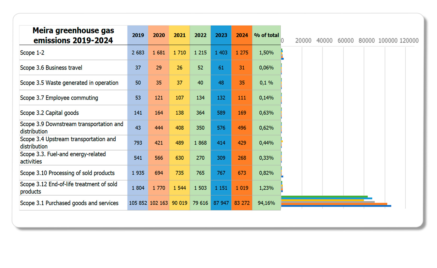 Meiran omaa toimintaa (scope 1-2) koskevat päästövähennystavoitteet ovat linjassa Pariisin ilmastosopimuksen tavoitteen kanssa. Meira on sitoutunut vähentämään omasta toiminnastaan johtuvia eli absoluuttisia scope 1 ja 2 -päästöjä 80 prosentilla vuoteen 2028 mennessä verrattuna vuoden 2019 päästöihin.