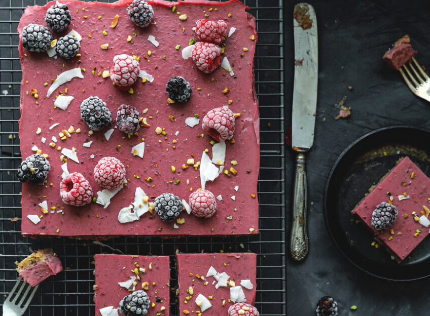 - Leikkaa leivokset n. 6 cm x 6 cm neliöiksi terävällä veitsellä. Koristele neliöt ennen tarjoilua marjoilla sekä kookoslastuilla, paahdetulla pistaasirouheella ja hasselpähkinärouheella.