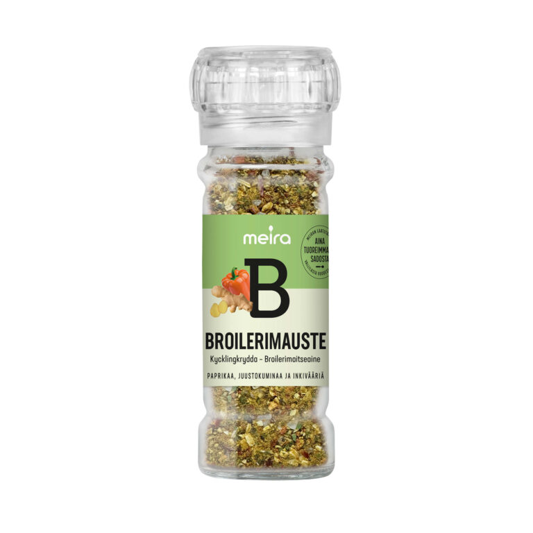 Meira Broilerimauste on monivivahteinen ja aromaattinen mausteseos, joka korostaa kanan ja muiden vaaleiden lihojen makuja. Sopii erinomaisesti paistamiseen, grillaamiseen ja uuniruokiin, sekä kastikkeisiin ja marinadeihin. Meiran laatutakuu: Meiran mausteet ovat aina tuoreimmasta sadosta, jolloin kaikki luonnolliset makuaromit ja tuoksut ovat tallella.