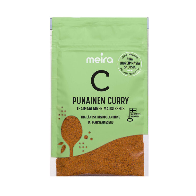 Meira Punainen curry on thaimaalainen mausteseos, joka sopii täydellisesti kookosmaidon kanssa käytettäväksi kastikkeisiin, keittoihin ja wokkeihin. Meiran laatutakuu: Meiran mausteet ovat aina tuoreimmasta sadosta, jolloin kaikki luonnolliset makuaromit ja tuoksut ovat tallella.