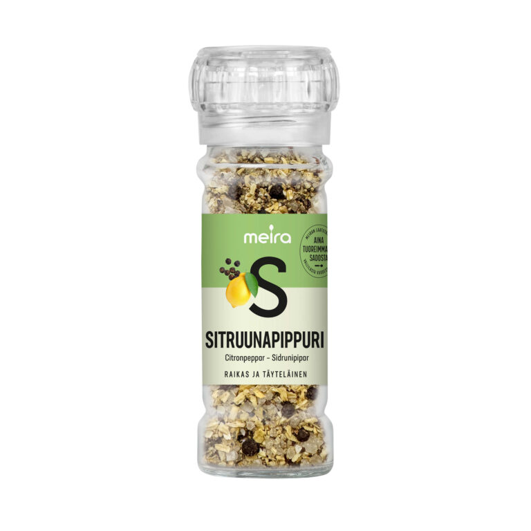eira Sitruunapippuri on klassinen mausteseos, joka yhdistää raikkaan sitruunan ja aromikkaan mustapippurin. Eloisa ja pirteä maku sopii erityisesti kalan, kanan ja kasvisten maustamiseen ja tuo annoksiin raikasta potkua. Meiran laatutakuu: Meiran mausteet ovat aina tuoreimmasta sadosta, jolloin kaikki luonnolliset makuaromit ja tuoksut ovat tallella.
